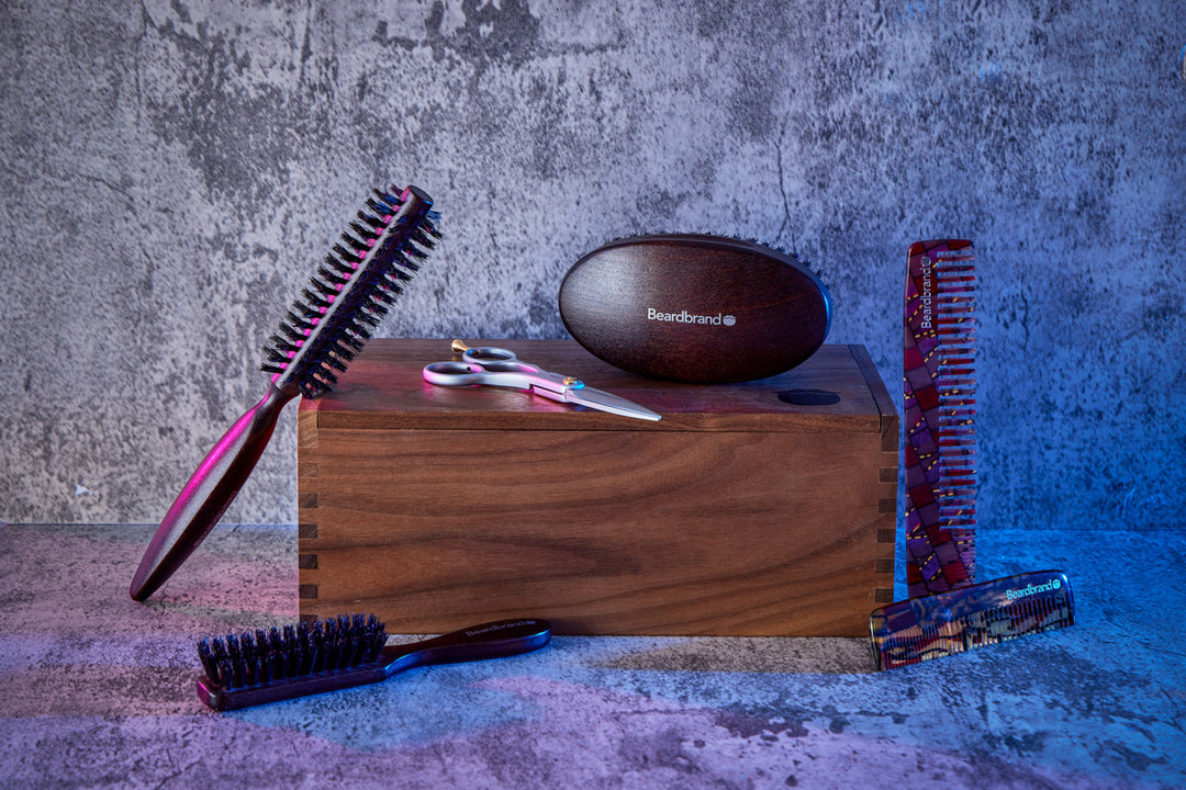 The Beard Grooming Kit has everything you need to rock your look with confidence. Housed in a black walnut box, It includes three versatile sizes of our 100% Boar’s Hair Brushes, travel-friendly Beard Trimming Scissors, and two incredibly smooth, limited edition cellulose acetate Beard Combs.